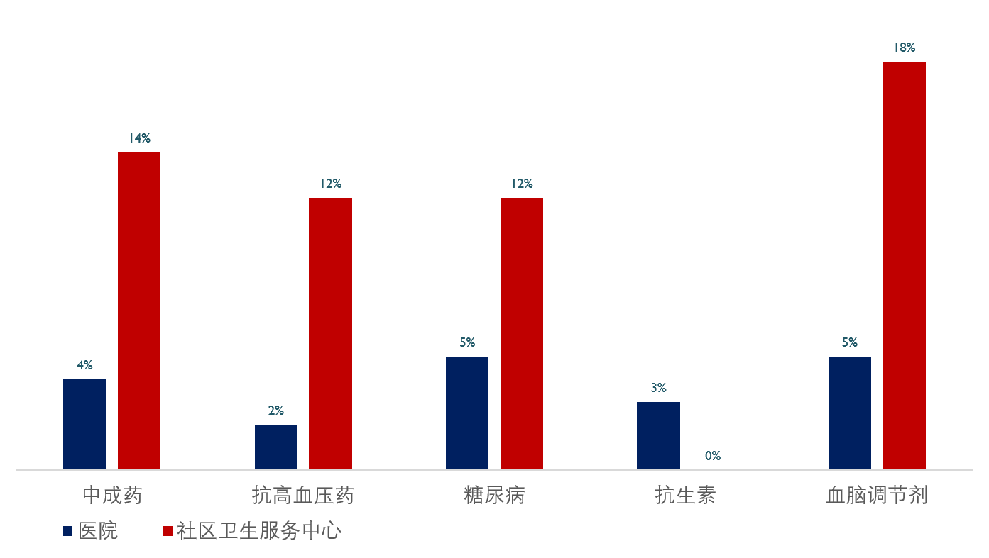 慢病基层防治空间巨大。根据IMSHealth《2016中国医药市场全景解读》,社区用药以中成药、抗高血压药、糖尿病药物、抗生素、血脑调节剂为主。并且在这四个用药领域,销售额增长率远高于医院渠道。