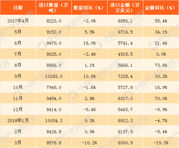 2017-2018年中国铁矿砂及其精矿进口情况一览表