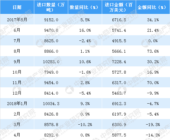 2017-2018年中国铁矿砂及其精矿进口情况一览表