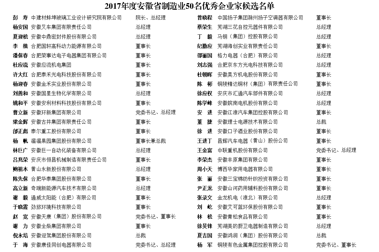 电子游艺官网讯:日前,安徽省为进一步激发企业发展活力和企业家创造力,推动省制造业做强做优做大,根据《安徽省人民政府关于印发支持制造强省建设的若干政策的通知》、《安徽省人民政府办公厅关于印发推进制造强省建设考评评价办法(试行)的通知》要求,经企业自荐、各市初审和择优推荐,省推进制造强省建设领导小组办公室按照考核、评审的程序,评选出2017年安徽省制造业50名优秀企业家候选人名单。以下为具体名单: