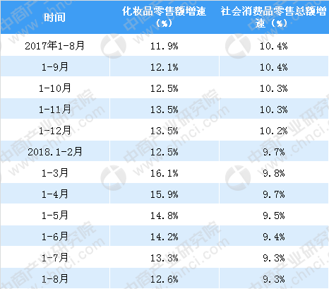 从增速来看,2018年1-8月全国化妆品零售额同比增加12.6%,高于同期社会消费品零售总额增速3.3个百分点。