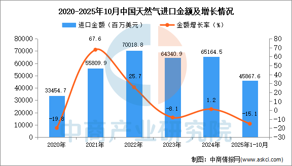 从金额方面来看,数据显示,2025年1-10月我国天然气累计进口金额45867.6百万美元,同比下降15.1%。
