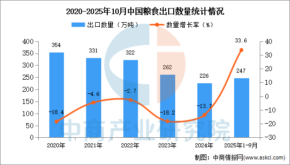 电子游艺官网讯:据中商产业研究院数据库显示,2024年我国粮食的出口量226万吨,同比下降13.7%。最新数据显示,2025年1-10月中国粮食出口量247万吨,同比增长33.6%。