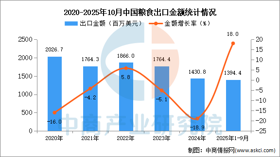 从金额方面来看,数据显示,2025年1-10月中国粮食出口金额1394.4百万美元,同比增长18%。