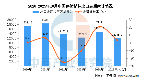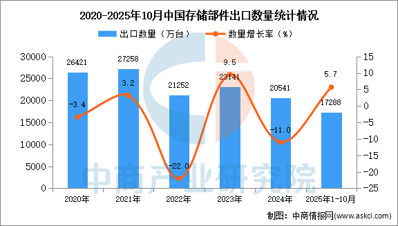 电子游艺官网讯:据中商产业研究院数据库显示,2024年中国存储部件出口量20541万台,同比下降11%。最新数据显示,2025年1-10月中国存储部件出口量17288万台,同比增长5.7%。