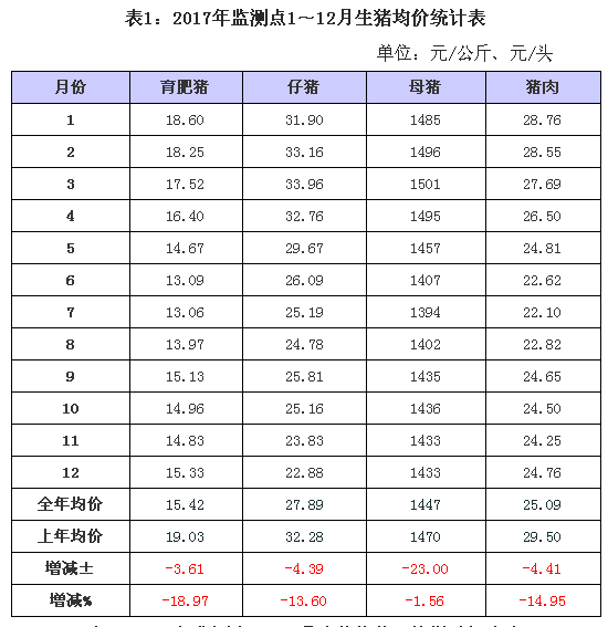1)育肥猪:2017年1月,四川省育肥猪出栏均价稳定在18.60元/公斤左右,自2月开始连续下跌17周至6月上旬,盘整8周后在7月底创下全年最低价位12.98元/公斤,之后连续拉升8周到9月下旬的19.20元/公斤,第4季度总体稳定、小幅震荡至年底15.42元/公斤收官。全年均价15.42元/公斤,虽较2016年下跌3.61元/公斤、跌幅达18.97%,但与2015年均价相当。全年走势呈“海鸥展翅”型,上半年走势与2010、2012~2015共计5年类似:开年即下跌,但又有所不同,一是反复筑底、触底时间晚于近年,二是节日效应日趋减弱,依托需求来提振猪价的作用被弱化。